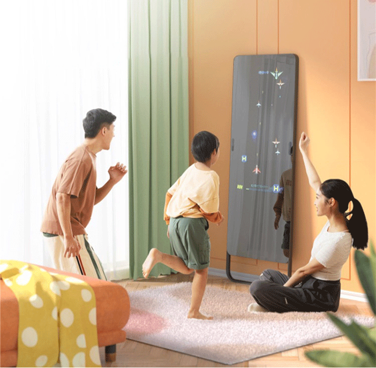 Tampilan signage digital interaktif 65 inci yang dapat disesuaikan, cermin kebugaran berdiri di lantai ajaib, layar sentuh